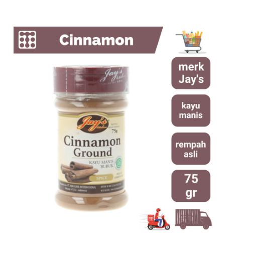 Jay's Cinnamon Ground Kayu Manis Bubuk 75 g merupakan bumbu perasa dari kayu manis pilihan, murni, alami, dan tanpa bahan pengawet. Bumbu ini mampu memberikan aroma harum yang cocok untuk hidangan penutup serta berbagai masakan salah satunya kari. Jay's Cinnamon Ground diproduksi dengan mesin modern, sehingga terjaga kebersihannya dan telah tersertifikasi Halal dari MUI.