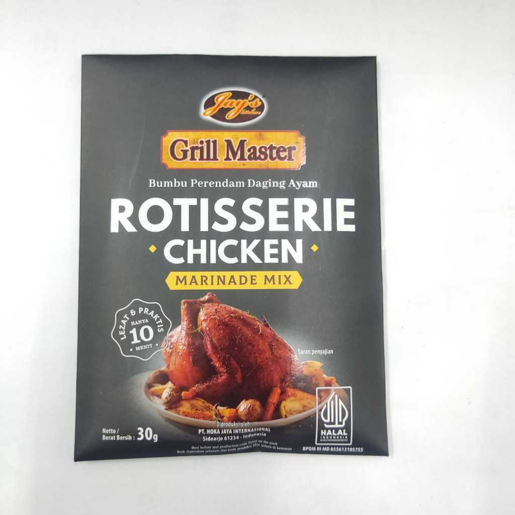 **JAYS Grill Master Rotisserie Chicken** adalah produk bumbu atau saus yang dirancang khusus untuk memberikan rasa lezat pada ayam yang dipanggang atau diproses dengan teknik rotisserie (memanggang ayam dengan cara berputar di atas api atau pemanggang). Bumbu ini mengandung campuran rempah-rempah yang cocok untuk ayam, dengan cita rasa gurih, sedikit manis, dan kaya akan aroma.
