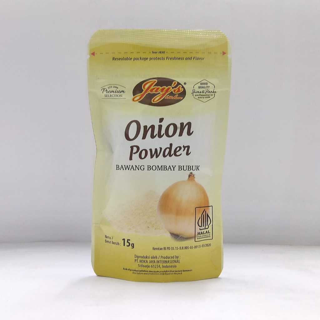 Jay's Onion Powder adalah produk bumbu yang terbuat dari bubuk bawang bombay kering. Bumbu ini sering digunakan untuk memberikan rasa gurih dan aroma bawang pada berbagai masakan, seperti sup, saus, daging, atau hidangan berbasis sayuran. Onion powder lebih praktis daripada menggunakan bawang segar karena bisa langsung ditambahkan ke masakan tanpa perlu dipotong atau dicincang terlebih dahulu. Produk ini bisa ditemukan dalam bentuk kemasan botol atau sachet dan sangat populer di dapur untuk masakan sehari-hari.