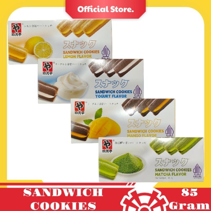 Biskuit sandwich dengan isi cream yogurt, Mango, Lemon dan Match ditengah nya.