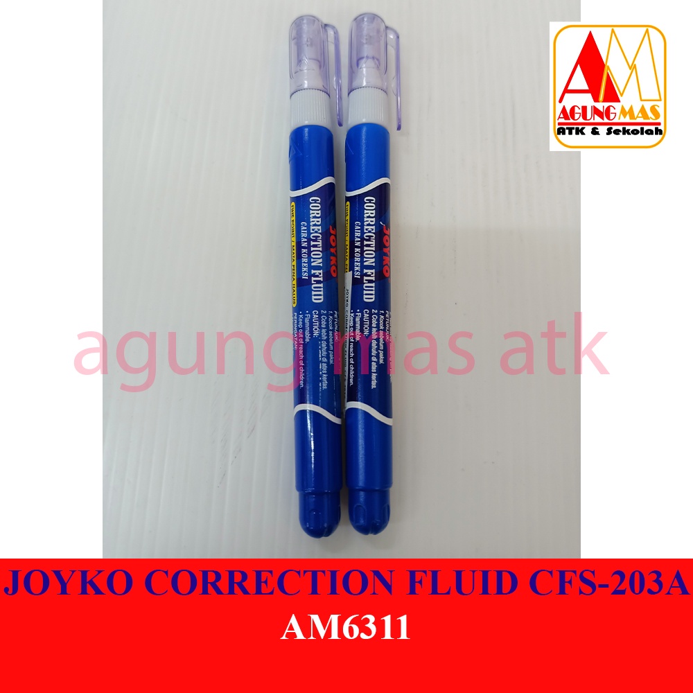 Correction Fluid Koreksi Joyko CFS-203A, Ukuran Produk : Panjang 12.6 cm x Diameter 1.7 cm, Metal Tip ( Ujung Logam ), Fine Point ( Mata Pena Halus ), Tipe : Cairan, Warna : Biru kombinasi Putih