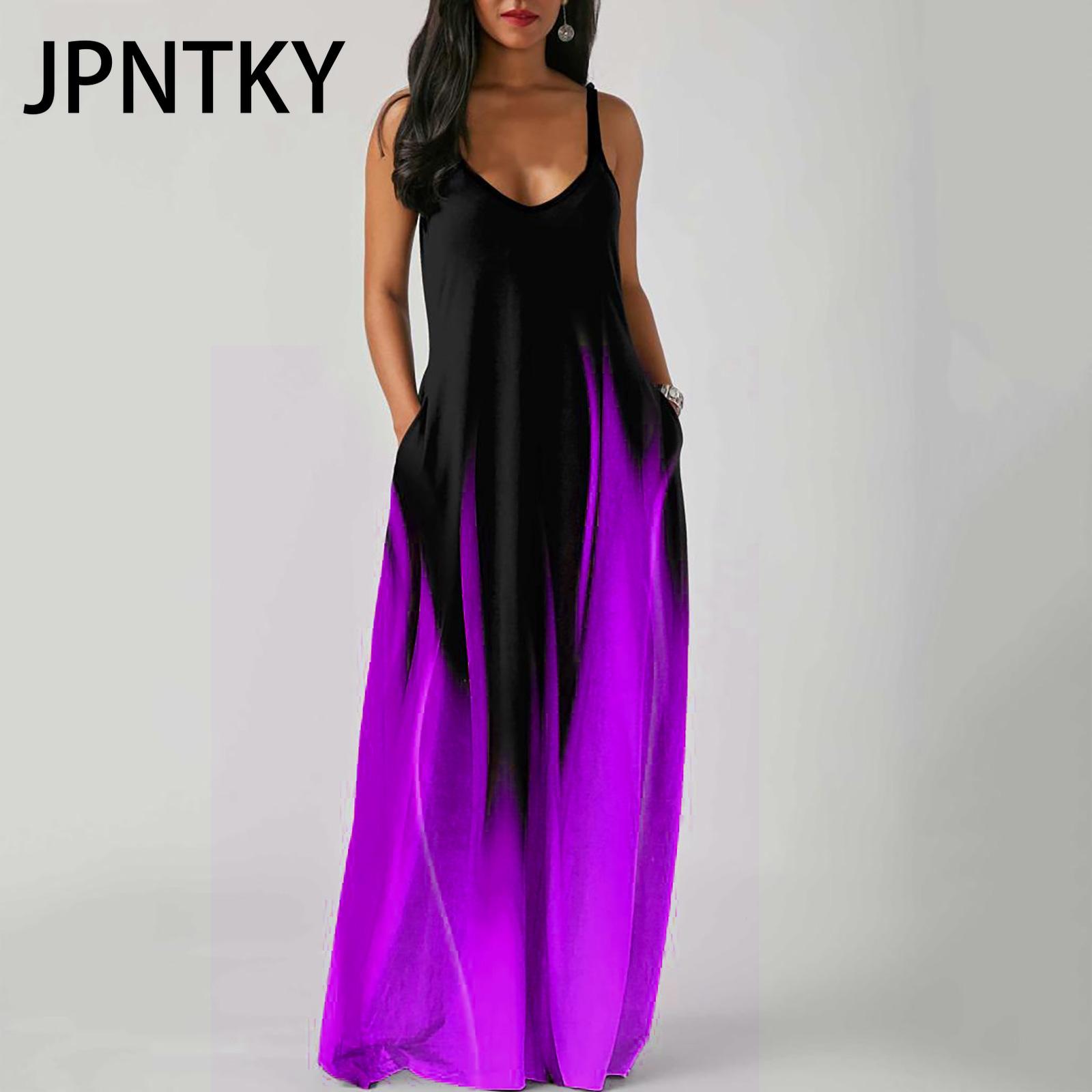 JPNTKY Элегантное модное платье в пол без рукавов с V-образным вырезом, простое женское летнее платье в стиле ретро с принтом, свободное в талии, прямого кроя M фиолетовый