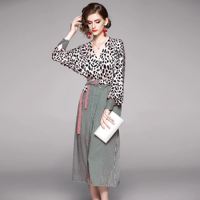 JSXDHK 2021 осенне-зимнее женское Повседневное платье с V-образным вырезом рукавом летучая мышь леопардовым отрезным поясом модное элегантное п...