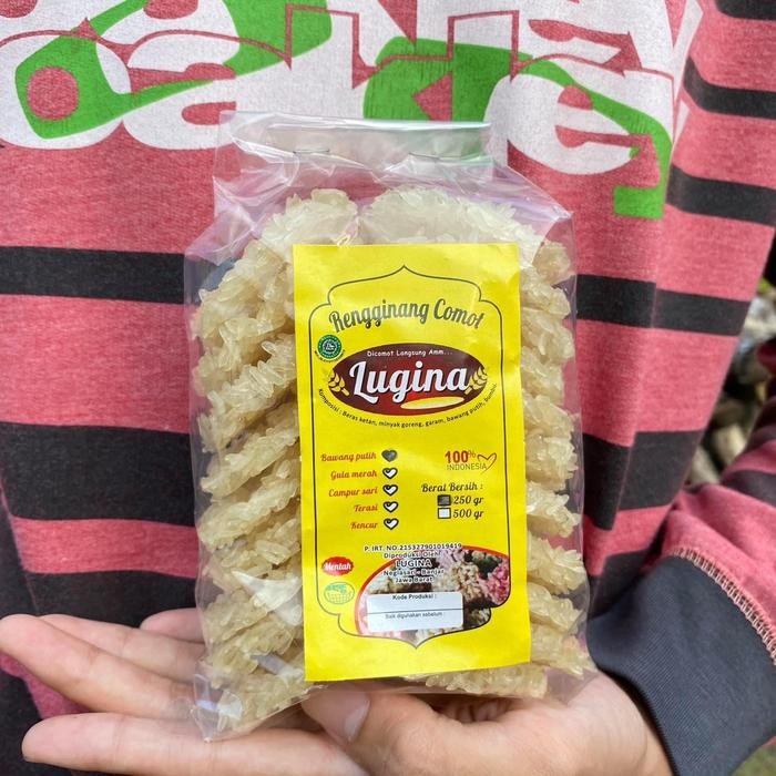 Rengginang atau biasa di sebut ranginang, merupakan makanan tradisional sejak dulu. Ranginang Lugina menghadirkan inovasi baru yaitu dengan munculnya ranginang comot. Salah satu produk unggulannya adalah ranginang comot warna. Makanan ringan yang khas dengan bentuk yang imut serta warna yang menarik. Ranginang lugina Sudah memiliki label Halal dari MUI-JB 01101138330615 dan sudah terdaftar P.IRT. No. 215327901019419 Variasi produk rengginang lugina : 1. Comot warna 2. Comot terasi 3. Comot bawang putih 4. Comot kencur 5. Comot gula 6. Oval terasi 7. Oval bawang putih 8. Oval gula Pengiriman FREE BUBBLE WRAP DUS