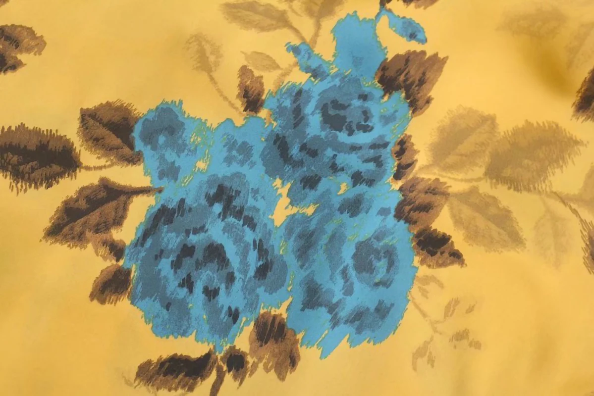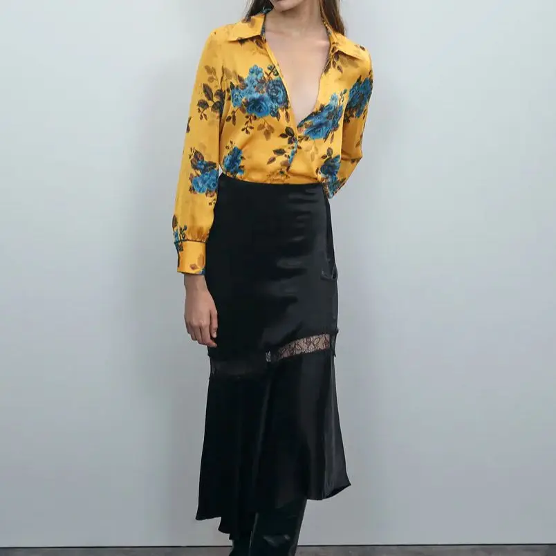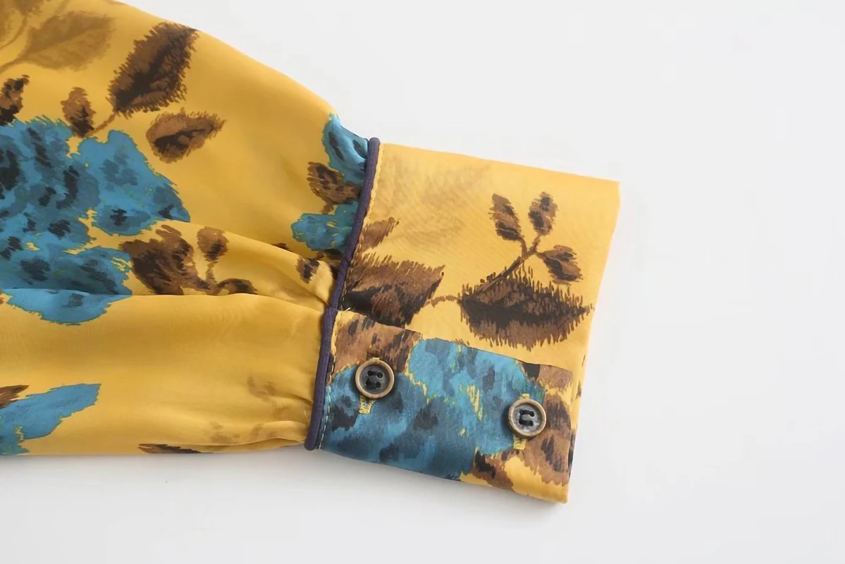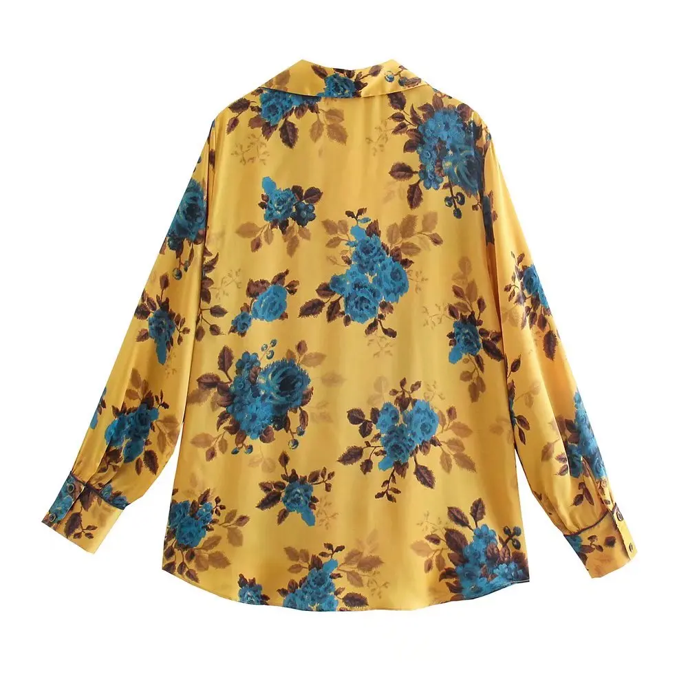 JUNWU Осенняя женская желтая шелковая атласная текстура с цветочным принтом с лацканами однобортная блузка с длинным рукавом Великолепная бл...