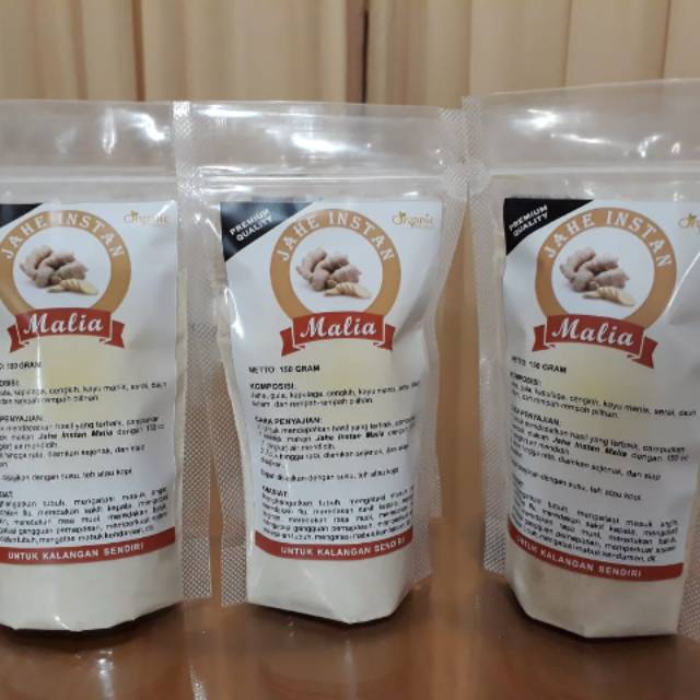 Jahe Instan Malia dibuat dengan bahan-bahan premium dan organik. Jahe instan Malia ini juga mengandung campuran rempah-rempah terpilih yaitu: Kencur, Serai, Adas, Jinten, Kapulaga dan lain2.