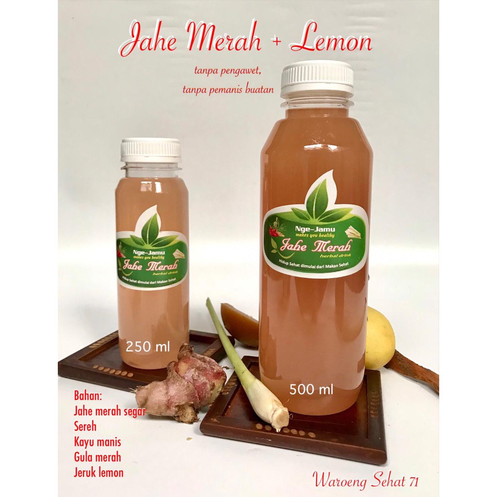 Wedang Jahe merah produksi Waroeng Sehat 71 menggunakan 100% bahan-bahan alami pilihan tanpa pengawet dan tanpa pemanis buatan. Wedang jahe merah diolah secara tradisional dan dimasak dengan menggunakan panci keramik/priuk sehingga terjaga kualitasnya.