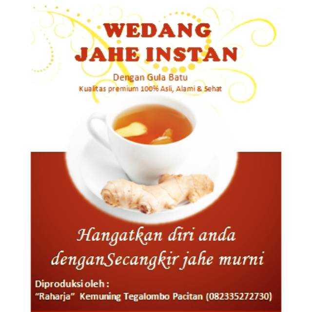 Minuman jahe instan alami. Terbuat dari sari jahe murni dan gula batu. Tanpa bahan pengawet