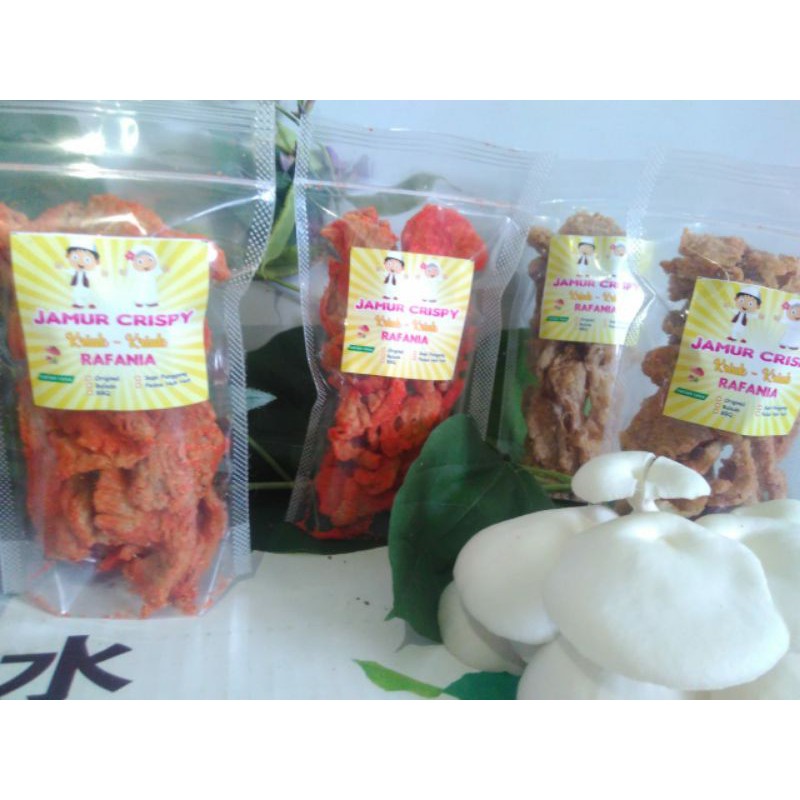 Jamur Crispy RAFANIA yang renyah enak dan gurih cocok untuk cemilan anda dengan varian rasa original, balado, sapi panggang, barbeque dan pedas huh hah.