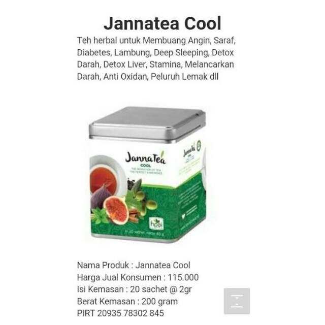 JannaTea Cool adalah minuman teh herbal sehat dengan sensasi Timur Tengahan sinergi dari herba terpilih yaitu Daun Zaitun, Daun Tin dan Biji Habbatussauda, Peppermint, Daun Bidara, Kayu manis, dan Kapulaga.