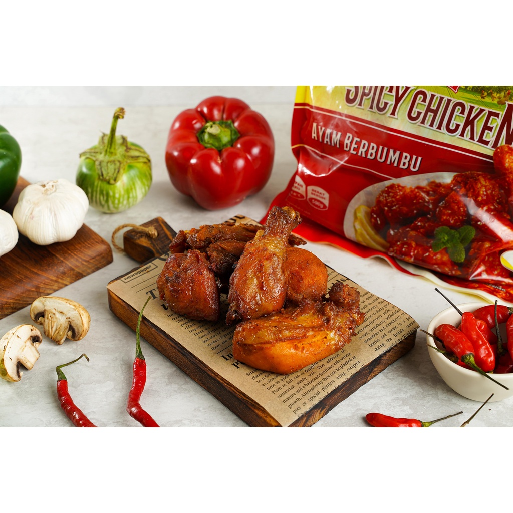 - Produk ini berisi Potongan Daging ayam utuh yang dibumbui dan diolah dengan menggunakan teknologi pengolahan modern dari Jerman