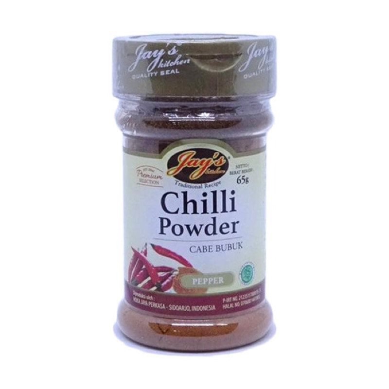 Jay'S Chili Powder [ 65gr ] adalah bumbu yang memiliki aroma yang sangat khas, hangat, dan kaya rasa. bubuk ini dapat digunakan untuk menyedapkan makanan. Terbuat dari bahan murni pilihan dan berkualitas serta diproduksi dengan mesin modern, tanpa pengawet.