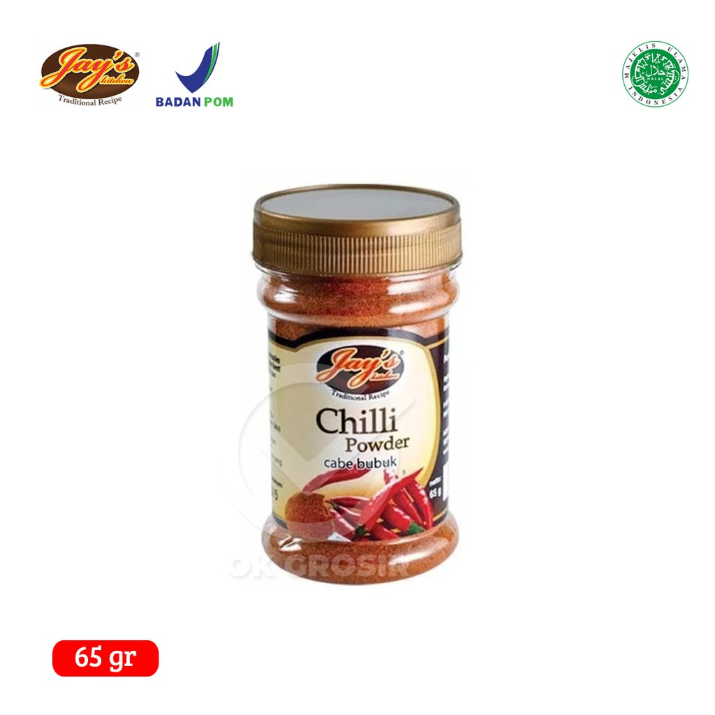 Bumbu masak cabe bubuk Jay's Chili Powder terbuat dari cabe merah asli pilihan, dapat ditambahkan pada segala jenis masakan terutama pada saus rendaman barbecue dan saus barbecue.