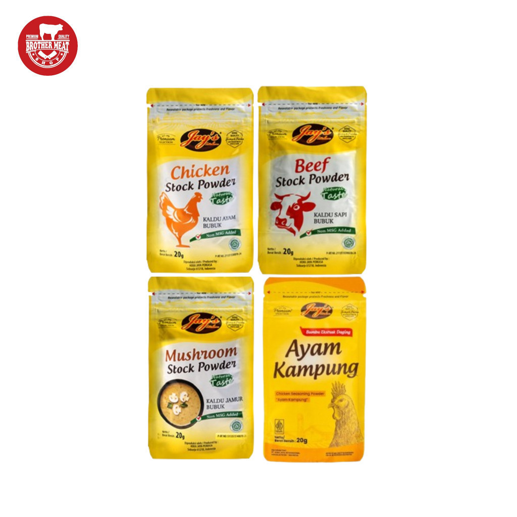 Jay's Kitchen Kaldu Bubuk Non MSG [20gr]. Kaldu & penyedap rasa Sapi, Ayam & Jamur tanpa MSG dapat digunakan dalam berbagai menu masakan seperti tumisan atau makanan berkuah lainnya.