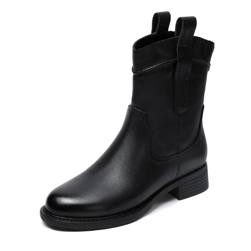 Johnature Британский стиль Натуральная кожа Сапоги Женские Сапоги Круглый Носок Универсальные Низкий Каблук Сапоги До Середины Икры 39 чёрный