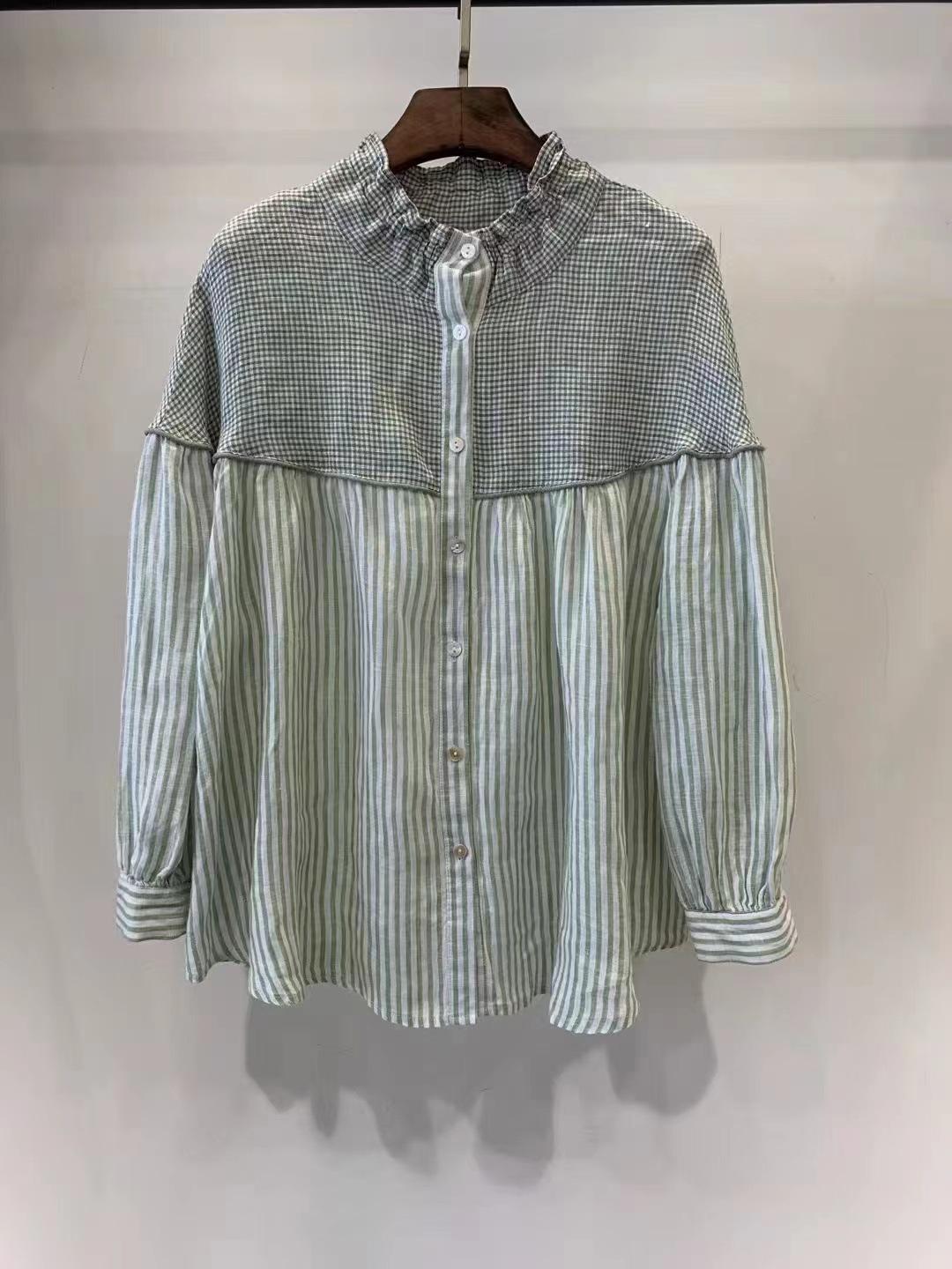 Johnature Весна Осень Клетчатая Рубашка Женская Универсальная Грибок Стоячий Воротник Кукла Повседневная Свободная Рубашка Женская One Size светло-зеленый