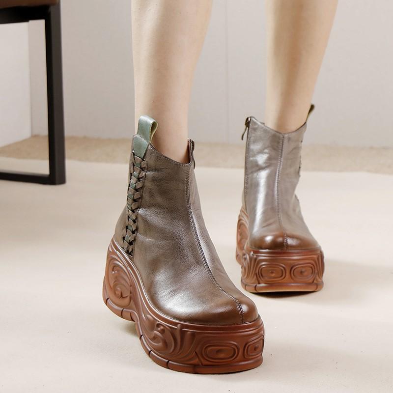 Johnature Натуральная кожа Круглый носок Толстая подошва танкетка Женские туфли Ретро короткие сапоги ручной работы 35 серый