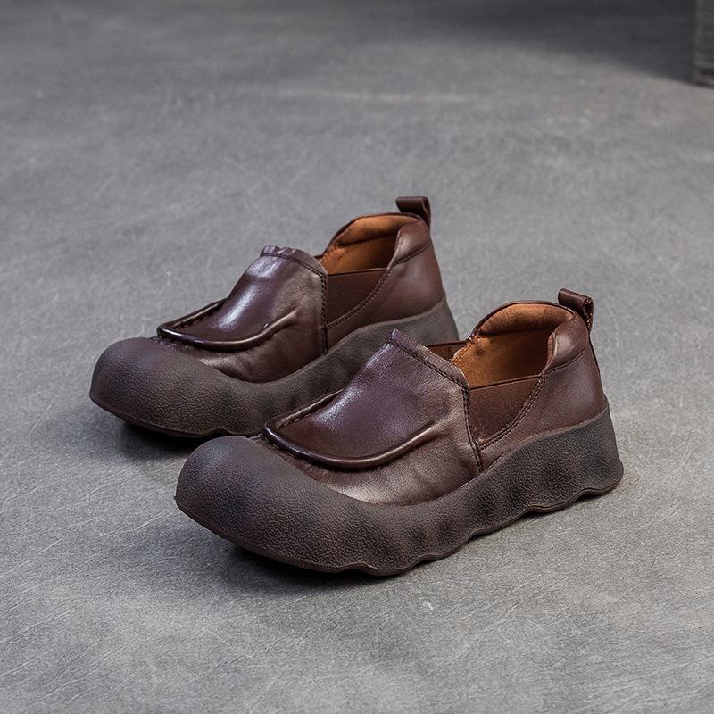 Johnature Натуральная кожа Лоферы Ретро Круглый носок Толстая подошва Универсальные женские туфли без застежек на плоской подошве 38