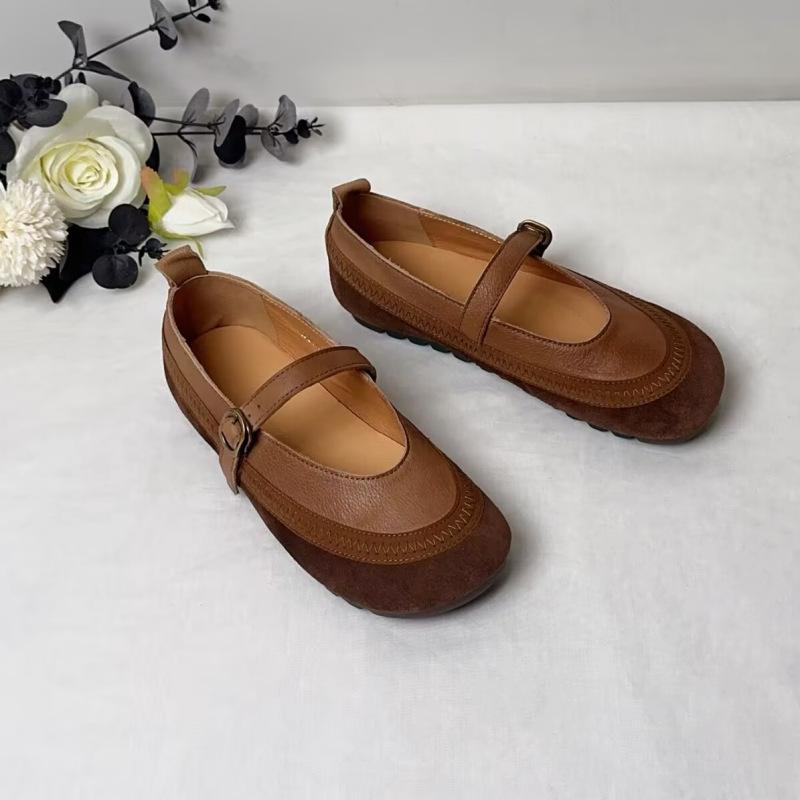 Johnature Натуральная кожа Мягкая подошва Ретро Женская обувь Универсальный Круглый носок Пряжка ремня Балетки 40