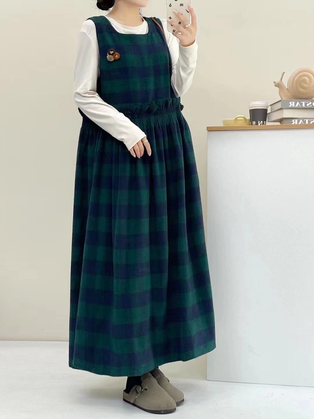 Johnature Ретро клетчатые платья осень-зима свободные универсальные пэчворк грибок край лес женское платье One Size зелёный