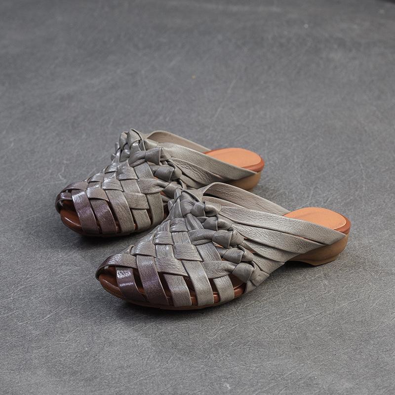 Johnature Ретро-тапочки ручной работы с открытым носком, летние дышащие и универсальные женские туфли из натуральной кожи 40 серый