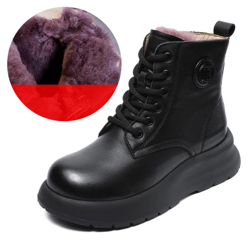 Johnature Ручная работа Натуральная кожа Шерсть Женские короткие ботинки Круглый носок Мягкая подошва Теплые хлопковые ботинки 41 чёрный