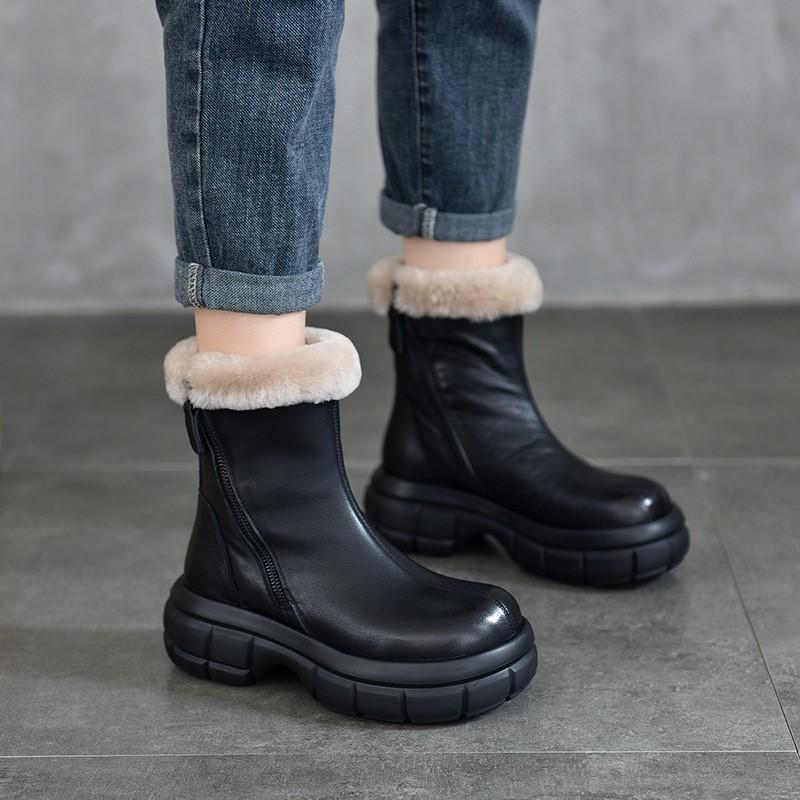 Johnature/теплые плюшевые ботинки на толстой подошве, женские ботинки из натуральной кожи, утепленные короткие ботинки с двойной молнией 36 чёрный