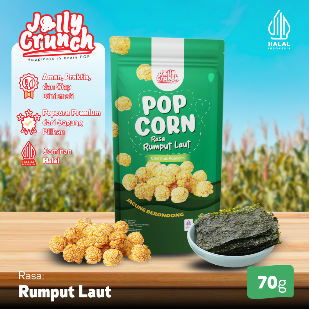 Nikmati setiap gigitan Jolly Crunch, popcorn dengan jagung pilihan berkualitas, tekstur yang renyah dan rasa khas rumput laut yang lezat.