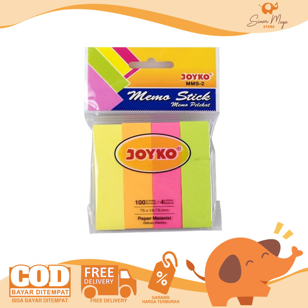 #Happy Shopping !Joyko Memo Stick MMS-2 merupakan kertas warna-warni untuk menulis sebuah catatan kecil yang dapat ditempel di kertas maupun permukaan vertikal seperti kaca dinding dan papan tulis putih.