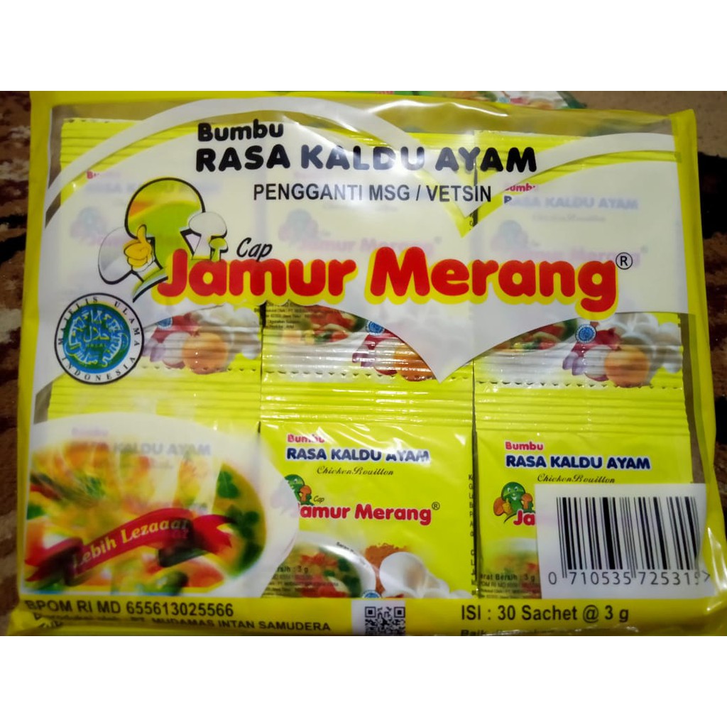 Kaldu Alami Halal & Murah Untuk Masakan Keluarga. Penyedap rasa alami pengganti penyedap yang biasa digunakan banyak mengandung MSG. Pilihan rasa :- Kaldu sapi- Kaldu ayam- Kaldu jamur alami 1 pack isi 30 sachet Harga Rp. 9750. Merk Jamur Merang. Berat @sachet 3 gr atau @pack 90 gr.