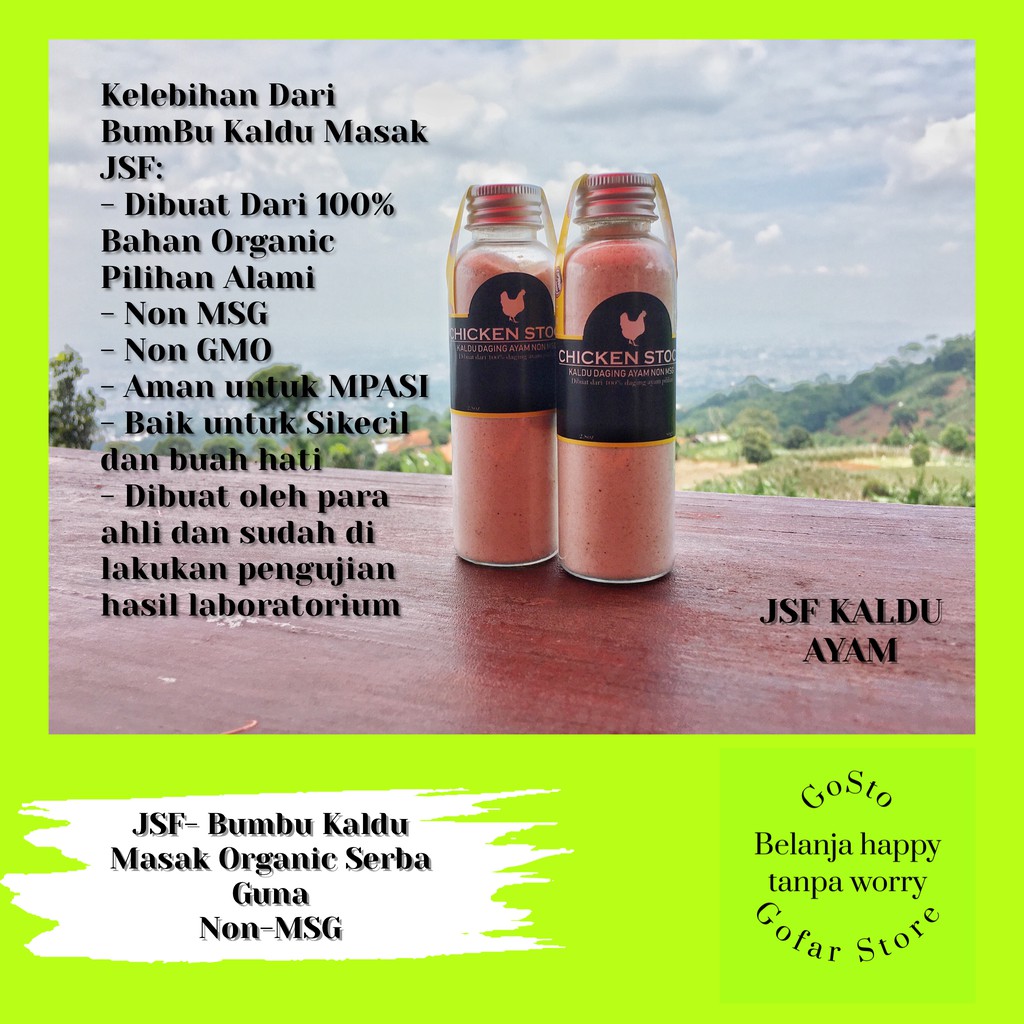 Kaldu Ayam Organic JSF : Terbuat dari ayam kampung (ayam lokal) pilihan, dan bebas MSG