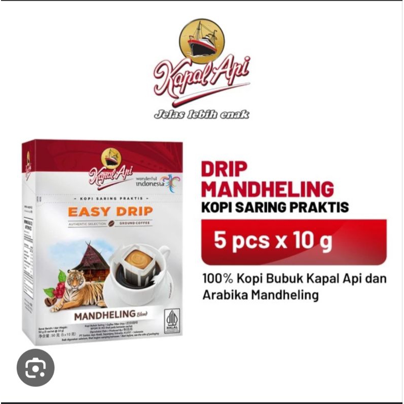 Paduan kopi pilihan dan kopi Arabika dari Kabupaten Mandailing Natal, Sumatera Utara. Kombinasi yang pas dalam kemasan kantong saring (drip bag) menghasilkan secangkir kopi Kapal Api Easy Drip Mandheling Blend dengan aroma harum, citarasa khas dan unik, serta bebas ampas.