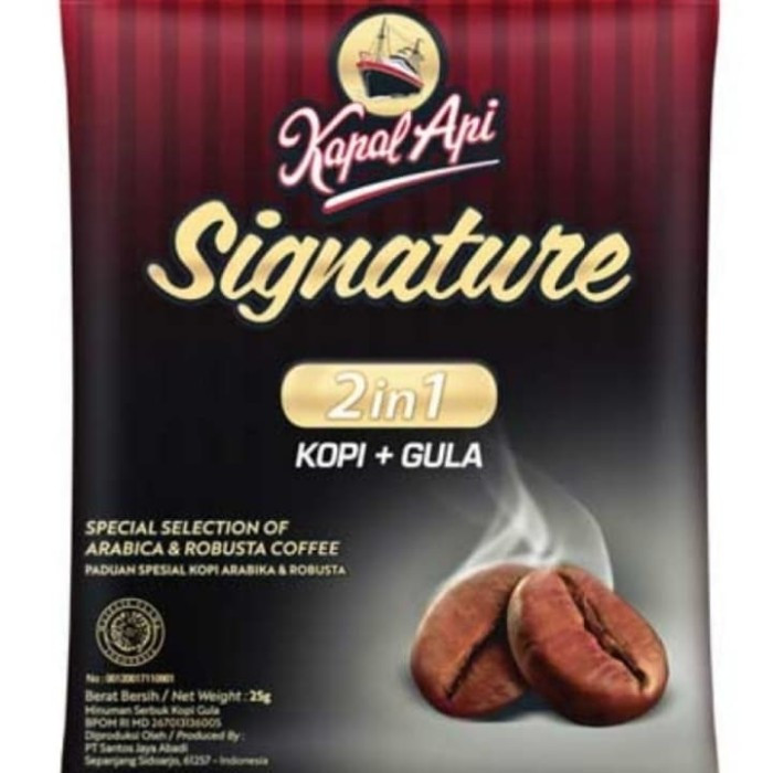 Kapal Api Signature Special selection of Arabica & Robusta Coffee. Kopi ini terbuat dari 100% Ground Coffee dengan Kualitas premium dari perpaduan biji arabika pilihan yang tersaji pada setiap cangkirnya, sangat cocok untuk dijadikan teman sarapan dengan roti dan snack lainnya.