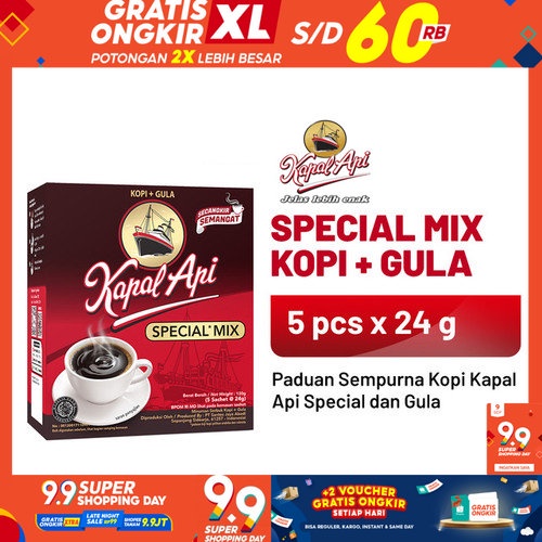 Kopi Kapal Api Special Mix terbuat dari paduan biji kopi berkualitas "Special" dan gula, menghasilkan aroma dan rasa yang jelas lebih enak, siap memberikan semangat untuk memulai hari. Tersedia dalam kemasan folding box isi 5 sachet. Keunggulan : komposisi :Gula,kopi bubuk