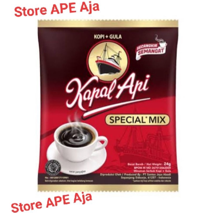 Kapal Api Special Mix dibuat dari biji kopi pilihan yang diolah dengan mesin yang paling modern dan campuran gula murni. Menjadikannya paduan special dari kopi dan gula. Kemasan praktisnya, membuat kopi anda siap seduh dengan aroma kopi senikmat selera pilihan. Mulai hari anda dengan secangkir semangat untuk Indonesia dengan Kopi Kapal Api.