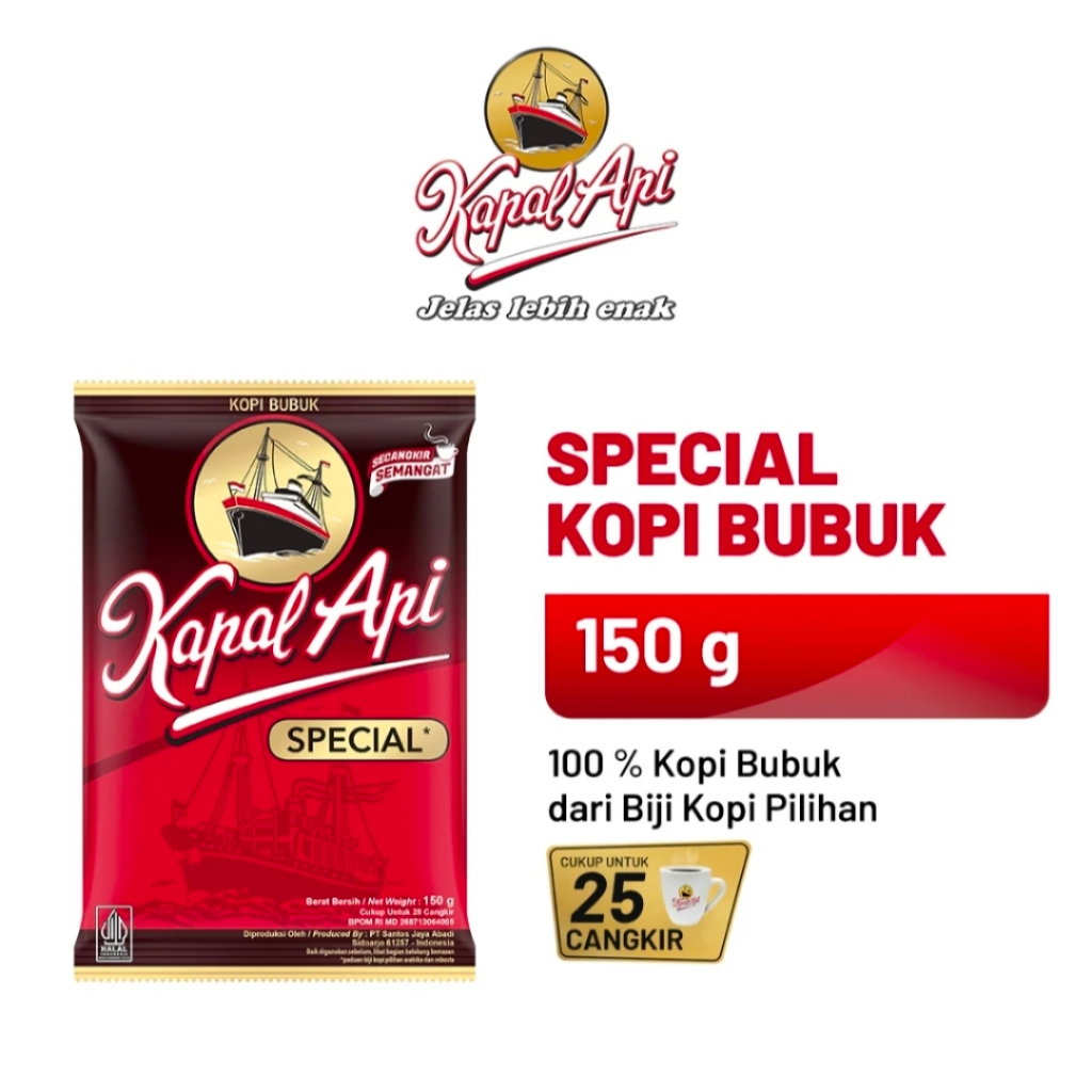 Kopi Kapal Api Special terbuat dari paduan biji kopi berkualitas "Special" menghasilkan aroma dan rasa yang jelas lebih enak, siap memberikan semangat untuk memulai hari. Tersedia dalam kemasan sachet 150gr, cukup untuk 25 cangkir..