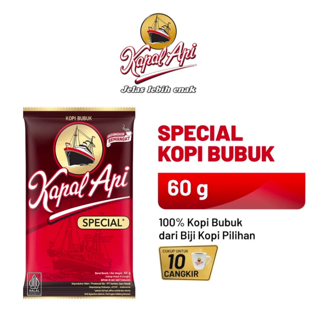 Kopi Kapal Api Special terbuat dari paduan biji kopi berkualitas "Special" menghasilkan aroma dan rasa yang jelas lebih enak, siap memberikan semangat untuk memulai hari. Tersedia dalam kemasan sachet 60gr