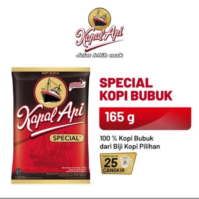 Kopi Kapal Api Special terbuat dari paduan biji kopi berkualitas "Special" menghasilkan aroma dan rasa yang jelas lebih enak, siap memberikan semangat untuk memulai hari. Tersedia dalam kemasan sachet 165gr, cukup untuk 25 cangkir..