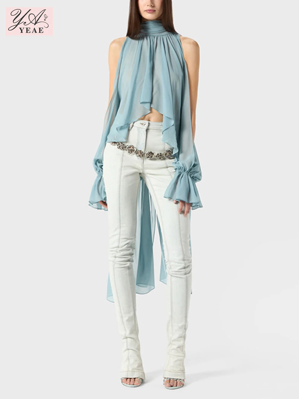 YEAE элегантные однотонные рубашки, женские модные шифоновые блузки, лето 2021, женские дизайнерские топы с открытыми плечами и длинными рукавами, новинка