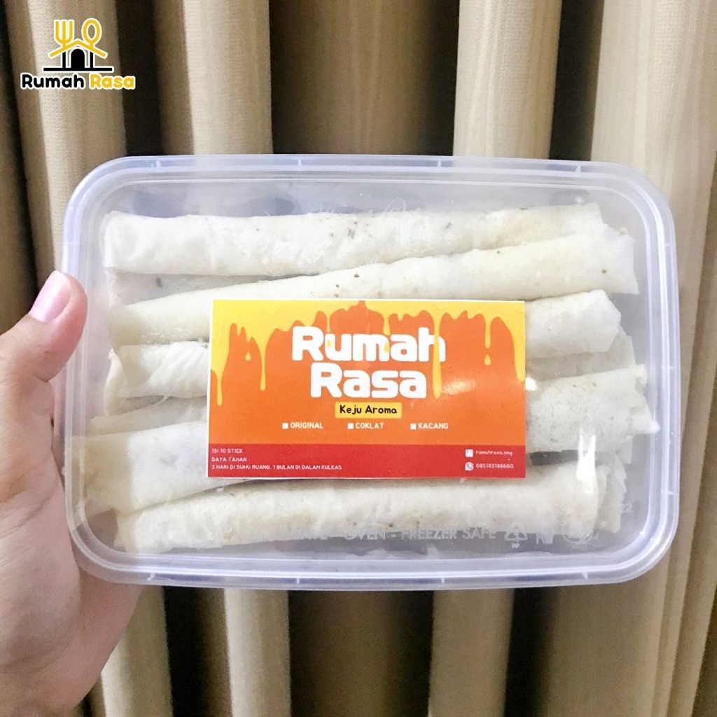 Keju Aroma Rumah Rasa menggunakan potongan keju, kulit lumpia dan taburan gula dan direkatkan menggunakan tepung kanji