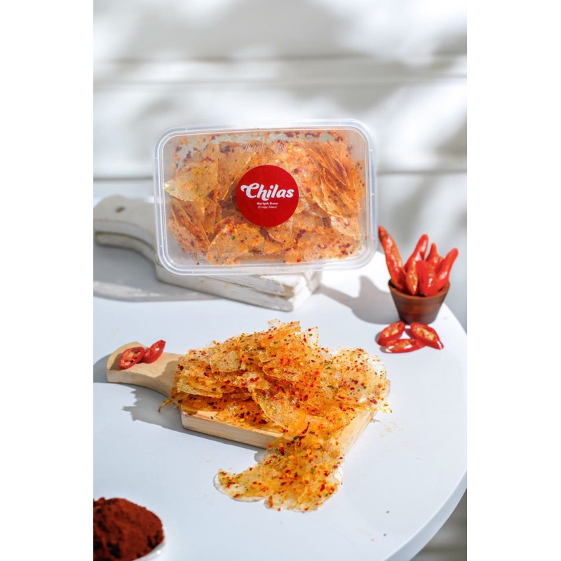 Keripik kaca terbuat dari bahan dasar singkong dengan tekstur tipis yang menyerupai kaca tetapi saat di gigit rasanya renyah. Keripik kaca ini mempunyai citarasa pedas yang gurih dan membuat orang ketagihan. Keripik kaca ini dapat menemani kalian yang suka nyemil cemilan pedas!