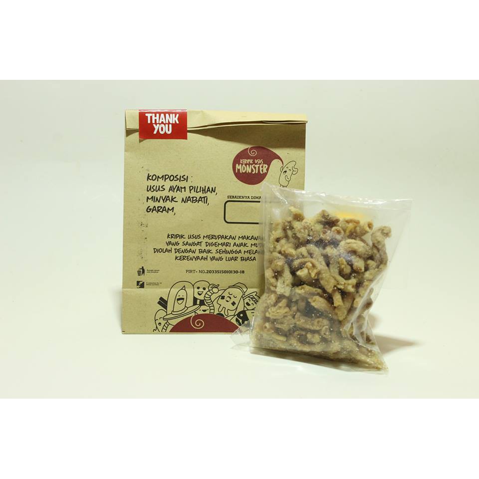 Keripik yang diolah dengan bahan dasar usus ayam segar pilihan yang diolah dengan rempah-rempah pilihan sehingga menghasilkan cemilan enak dan gurih,