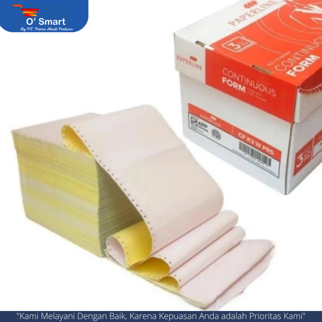 Kertas Continuous Form 3PLY CF K3 W PRS yang biasa digunakan untuk membuat laporan dengan printer Dotmatrik.
