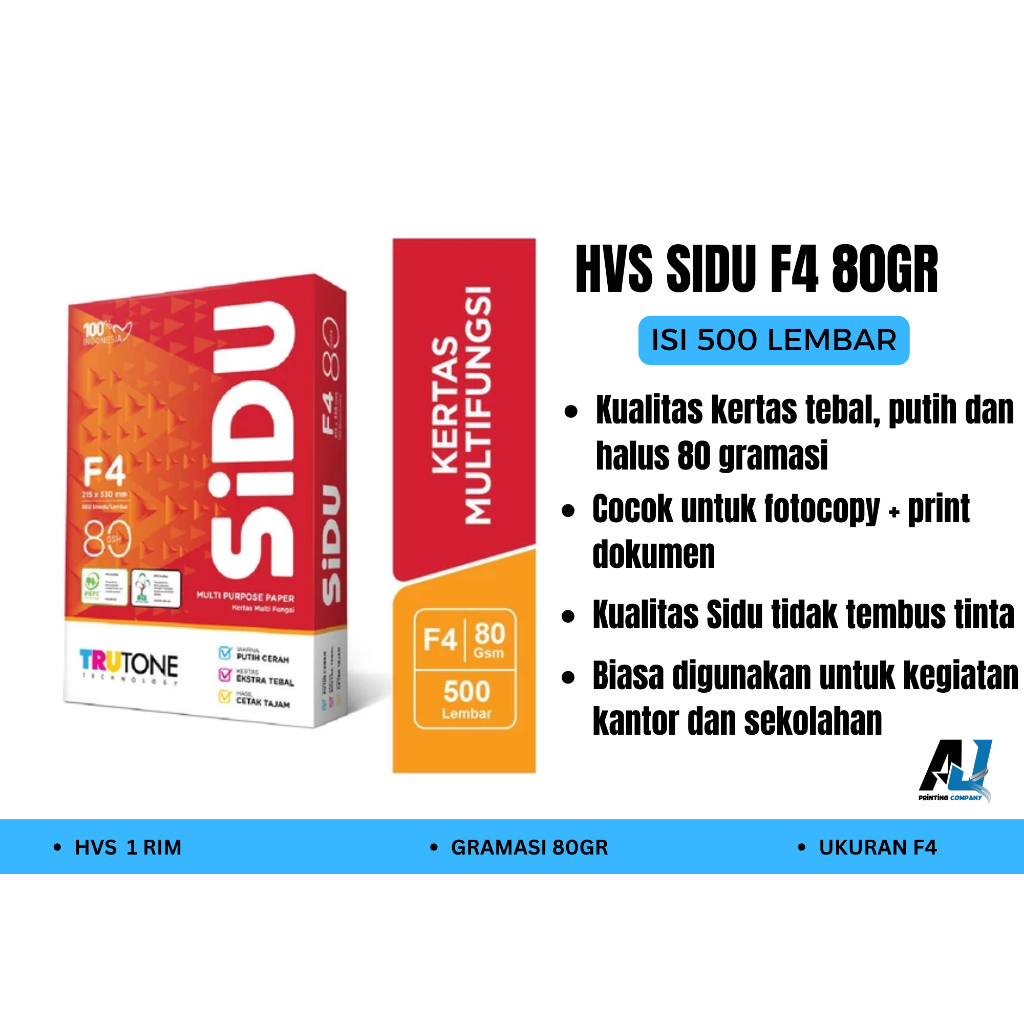 KERTAS HVS / FOTOCOPY / PRINT SIDU F4 80 GSM ( 1 RIM ) FOLIO