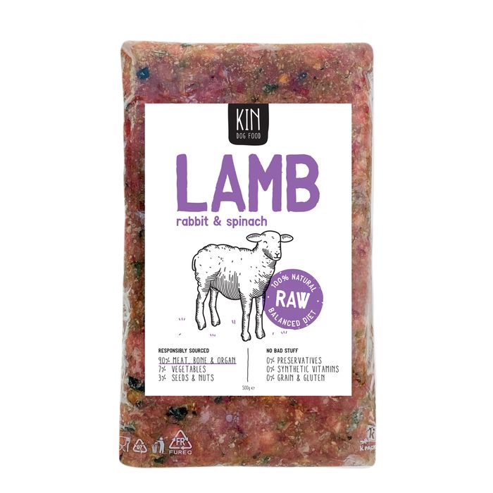 KIN Dog Food - Lamb Rabbit & Spinach 500gAll Natural, Raw Balanced Diet90% Meat, Bone & Organ7% Vegetables3% Seeds & NutsMade From Lean Boneless Australian Grass Fed Lamb.Rabbit is lean & low in saturated fat. Rich in B vitamin niacin & B6. Containsnatural sources of bio-available calcium, glucosamine and chondroitin.Wheatgrass is packed with chlorophyll, carotene, antioxidant vitamins andmineralsWheatgrass is a source of vitamin A, vitamin C, vitamin E (alpha tocopherol),vitamin K, thiamin, riboflavin, niacin, vitamin B6, pantothenic acid, iron,zinc, copper, manganese, and selenium.Green beans are full of important vitamins and minerals, such as protein, iron,calcium, and vitamins B6, A, C, and K.Green beans are a source of fiber and are low in calories.Chia seeds are a source of minerals such as manganese, copper, and zinc.Chia seeds are high in omega-3 fatty acidsSunflower seeds provide a source of Vitamin E, essential fatty acids & linoleicacid (LA).Pine nuts are high in beneficial monounsaturated fats, magnesium and vitamin EMade with whole foods for optimal nutrient absorptionAll natural, nothing artificialContains no added salt, sugar, wheat or soy100% Human-Grade IngredientsSafe raw food, quality assuredRecyclable Plastic Vacuum PouchINGREDIENTSLamb Loin, Whole Rabbit, Rabbit Heart, Rabbit Liver, Rabbit Kidney, Green Beans,Spinach, Sunflower Seeds, Chia Seeds, Pine Nuts & WheatgrassA RAW DIET IMPROVESAllergies & Skin Conditions, Digestion, Skin & Coat, Teeth & Oral Health, TheImmune System, Muscle Tone, Stool Size & Odor, Arthritis, Minimizes Disease,Overall Health & Your Dogs Lifespan.