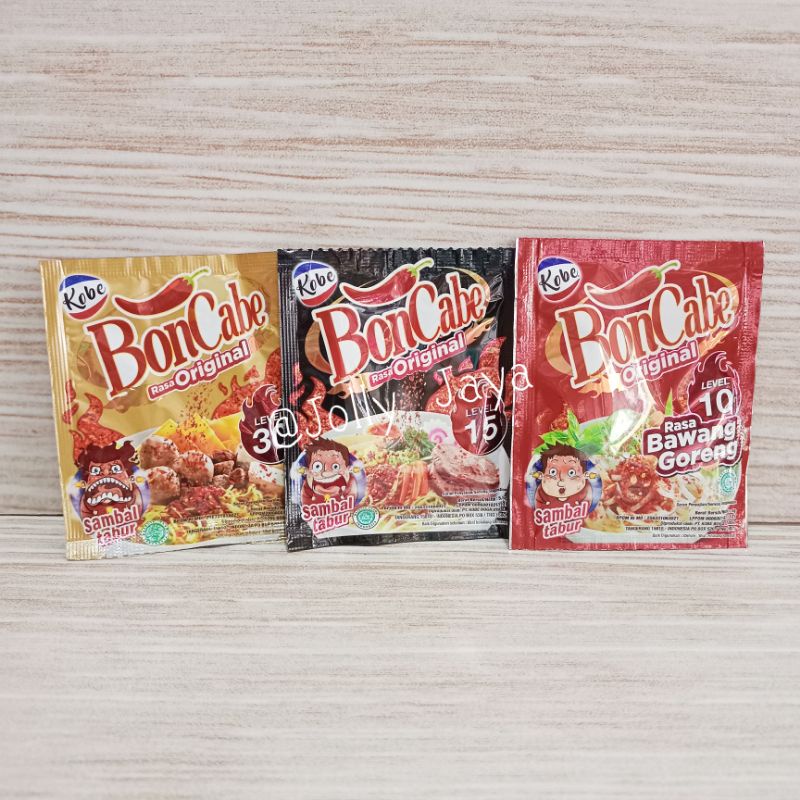Rasa Original Bon Cabe sambal tabur dibuat dengan cabai kering pilihan , dengan rasa pedas yg mantap.praktis dibawa saat berpergian. Taburkan Bon Cabe di atas nasi hangat, bakso , mie intsant, sup atau hidangan favorit lainny. Rasa pedas yg mantap akan membuat anda ketagihan.