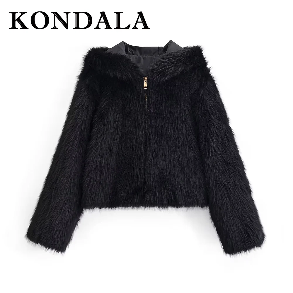 KONDALA шикарная черная роскошная пушистая зимняя женская куртка из искусственного меха с капюшоном, модная элегантная осенняя верхняя одежда 2025 года, благородное пальто для ночной вечеринки
