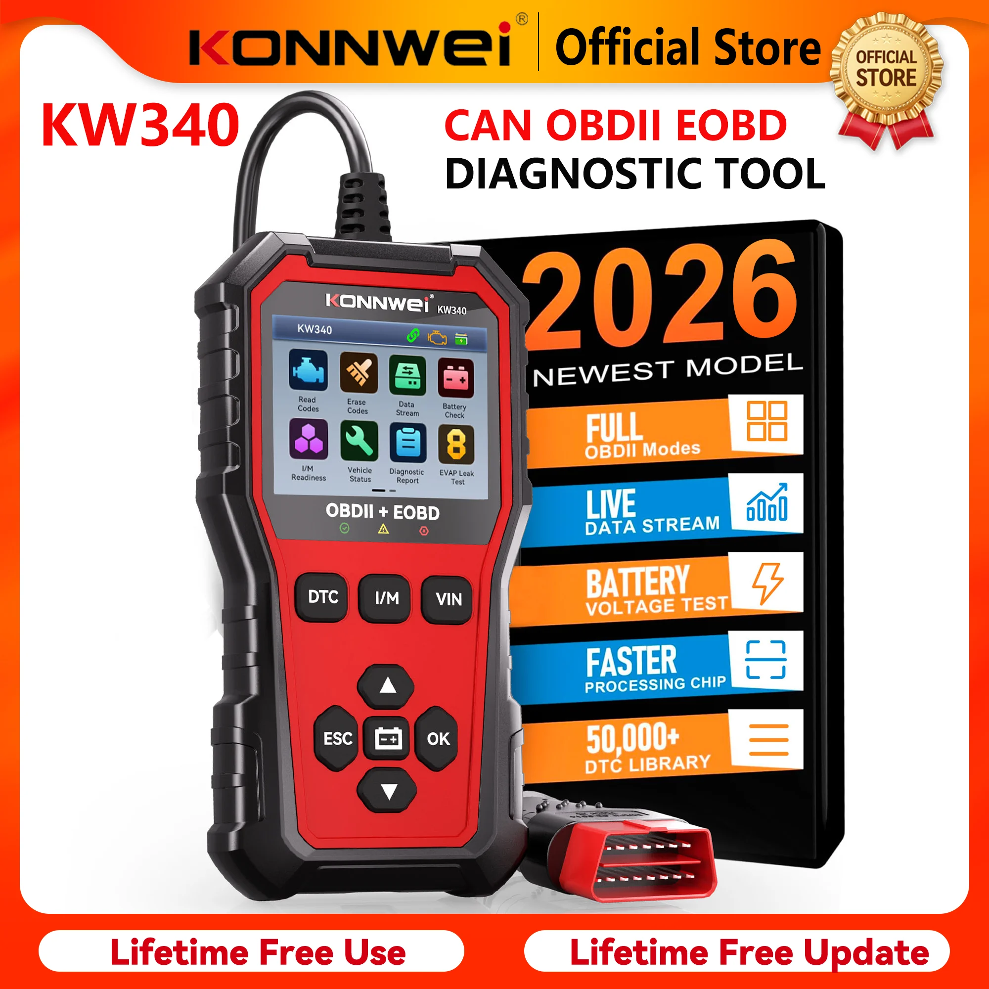 KONNWEI KW340 Car CAN OBD2 EOBD Scanner Diagnostic Tool Engine & Battery Test Read Fault Code Clear Real-Time Data O2 Inspection