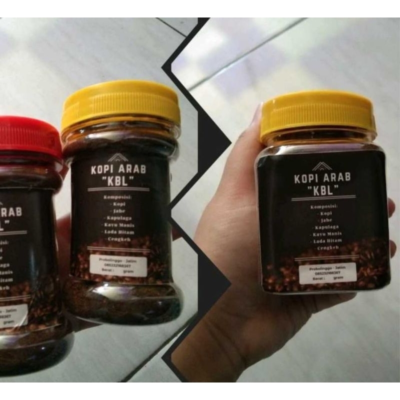 Kopi Arab atau kopi bubuk racikan dari berbagai bahan ; kopi, jahe, kayu manis, mrica hitam, kapulaga.