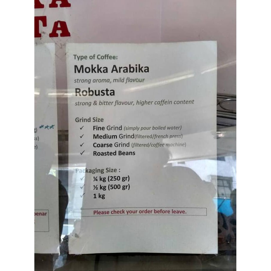 tersedia 4 jenis : kopi biji utuh, kopi giling kasar, kopi giling medium, kopi giling halus.